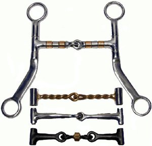 with Four Interchangable Mouthpieces! Stainless steel flat cheek training bit with 8" cheeks and four 5" interchangeable mouthpieces. From Showman Products. Versatility in one package. Mouthpieces Include: Copper Twisted Wire Snaffle Sweet Iron Snaffle With Dog Bone Center With Copper Roller, Stainless Steel Snaffle Mouth Stainless Steel Snaffle With Copper Rollers.