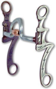 The Lightning Seven cheek is made with browned iron and trimmed with German Silver. It has a 4.5" shank, a 3" purchase, and stainless steel bit rings. This cheek provides a quicker pull on a horse's mouth and is excellent for horses that try to lip the bit.